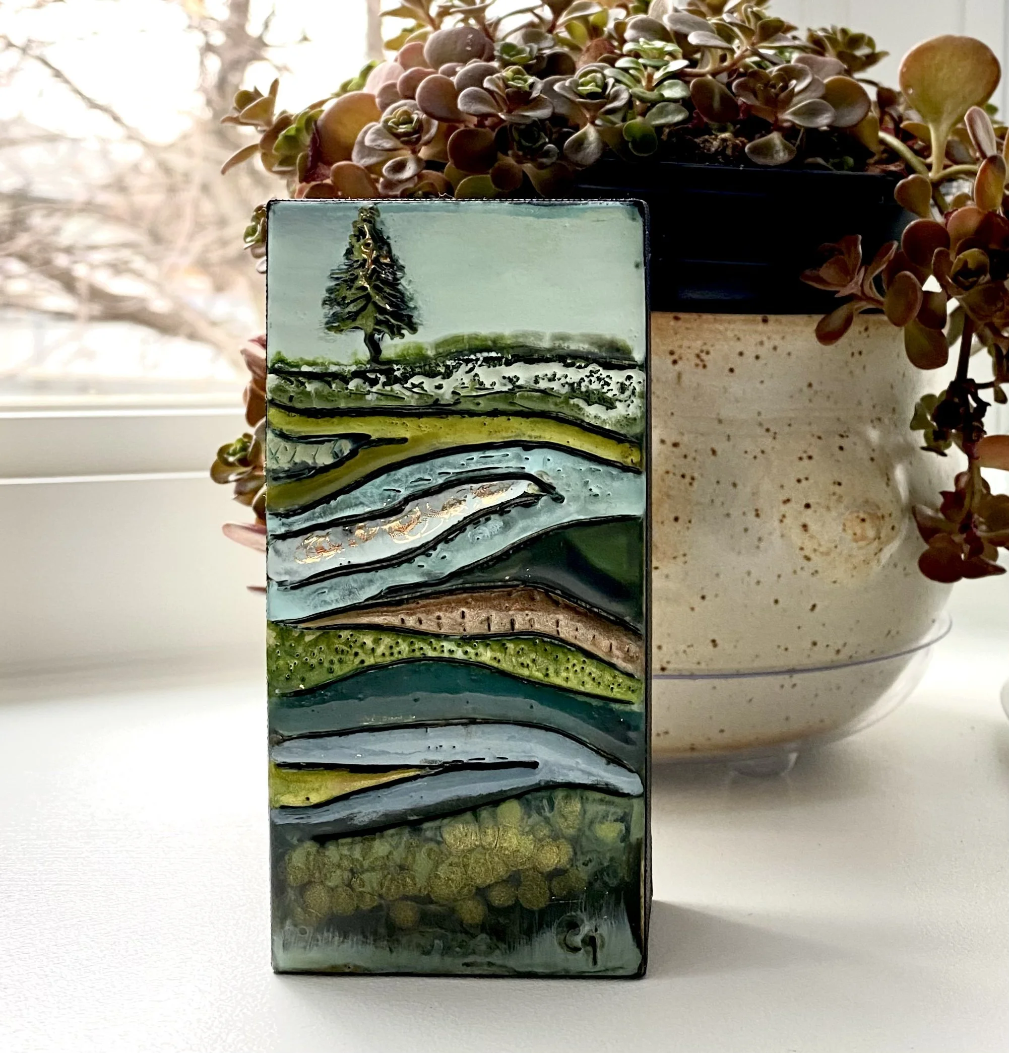 Each block comes with a small hook or notch for hanging or it can stand alone on a shelf. Available blocks are listed in my store for purchase.